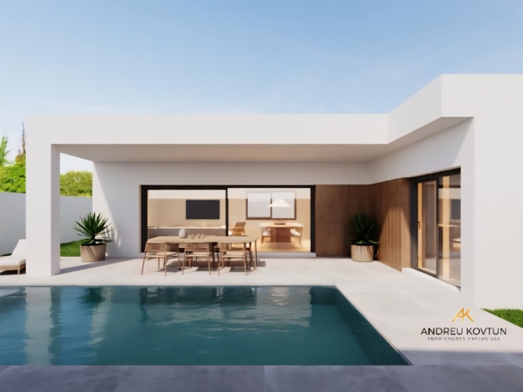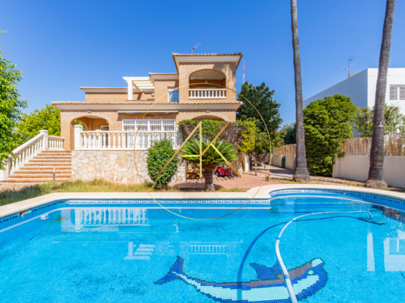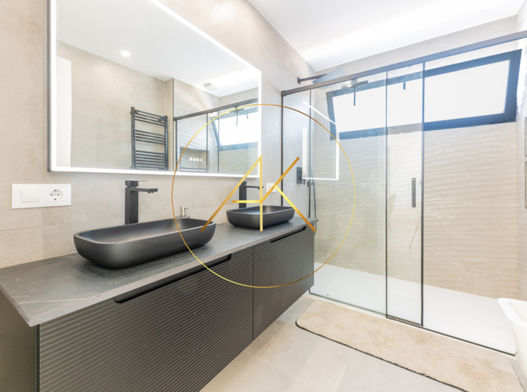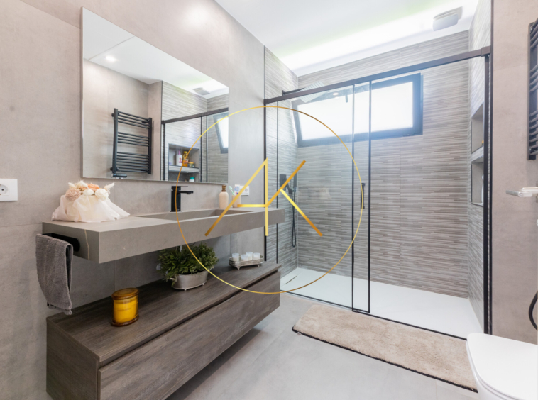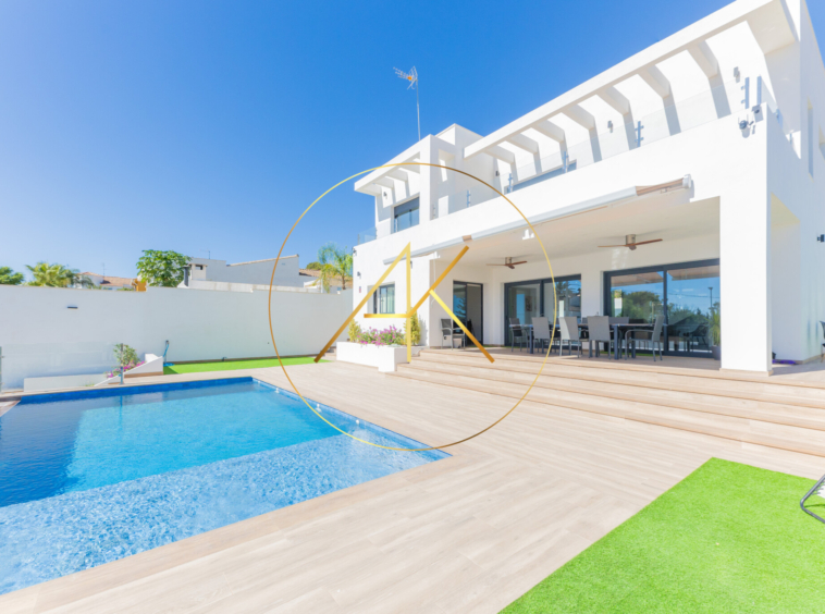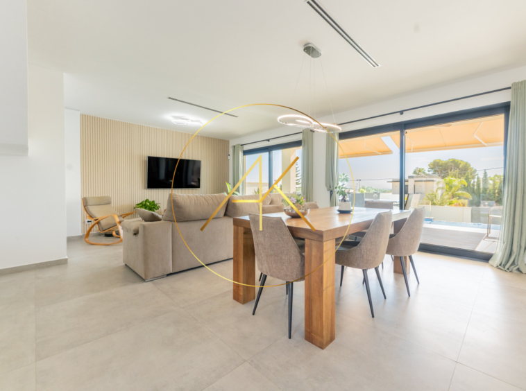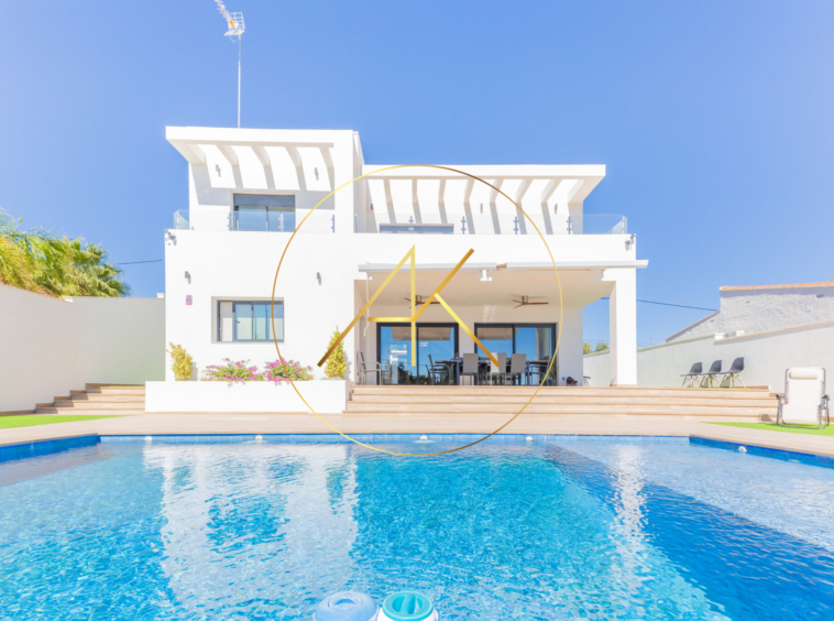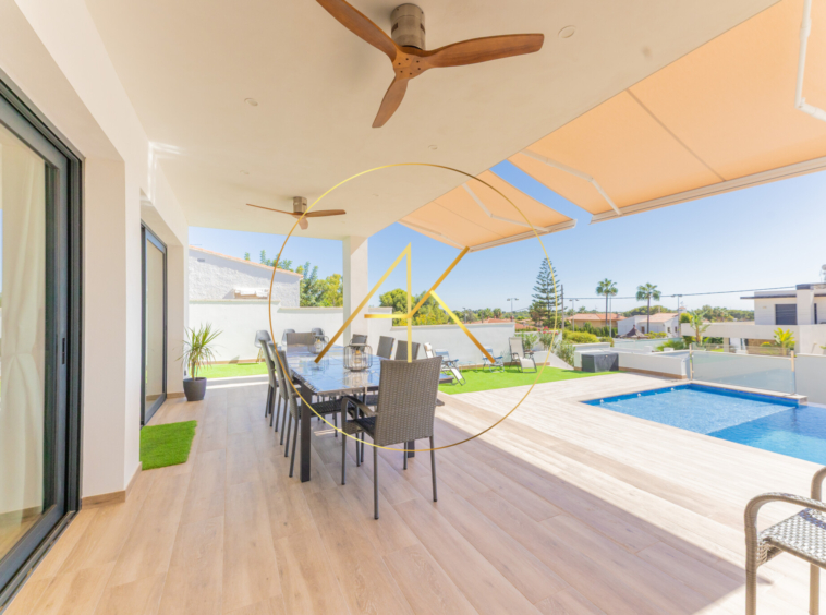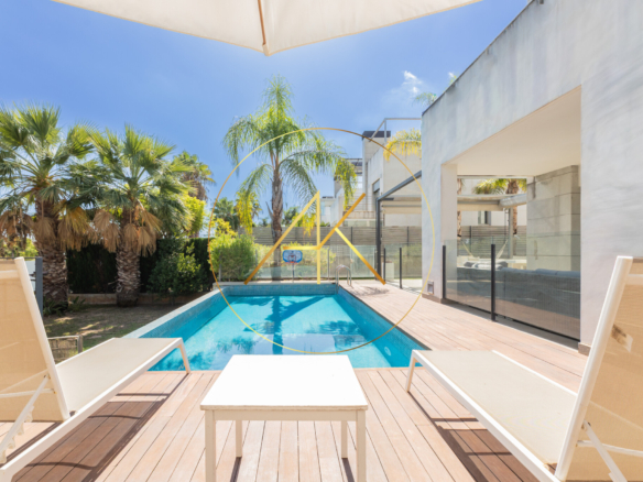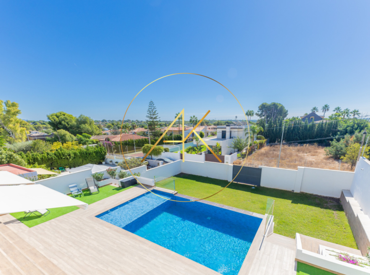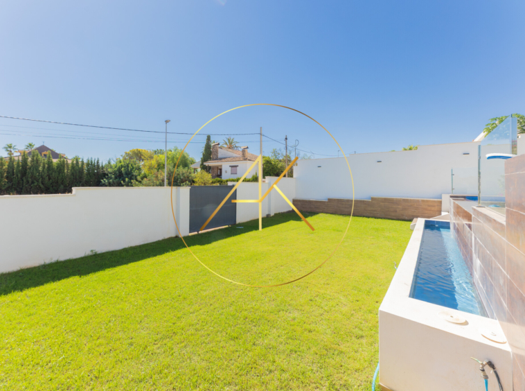 En la zona exterior, destaca la bonita piscina desbordante, con zonas de césped artificial y césped natural en la parte inferior.